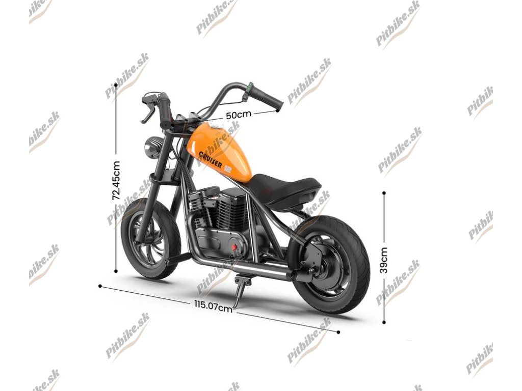 Hyper Gogo Cruiser 12 prináša štýlový chopper dizajn a spoľahlivý výkon určený pre deti od 6 do 12 rokov. Vďaka motoru 24 V/160 W a trom rýchlostným režimom (8 / 12 / 16 km/h) poskytuje bezpečnú, no stále vzrušujúcu jazdu. Dojazd až 10 km na jedno nabitie a jednoduché 4-hodinové nabíjanie zaručujú dlhé hodiny zábavy. Oceľový rám s vysokým obsahom uhlíka a 12″ nafukovacie pneumatiky zabezpečujú stabilitu aj na mierne nerovnom teréne. LED predné svetlo zvyšuje viditeľnosť pri súmraku. Tento základný model neobsahuje Bluetooth reproduktor ani aplikáciu na nastavenie parametrov jazdy, vďaka čomu je maximálne jednoduchý a spoľahlivý.